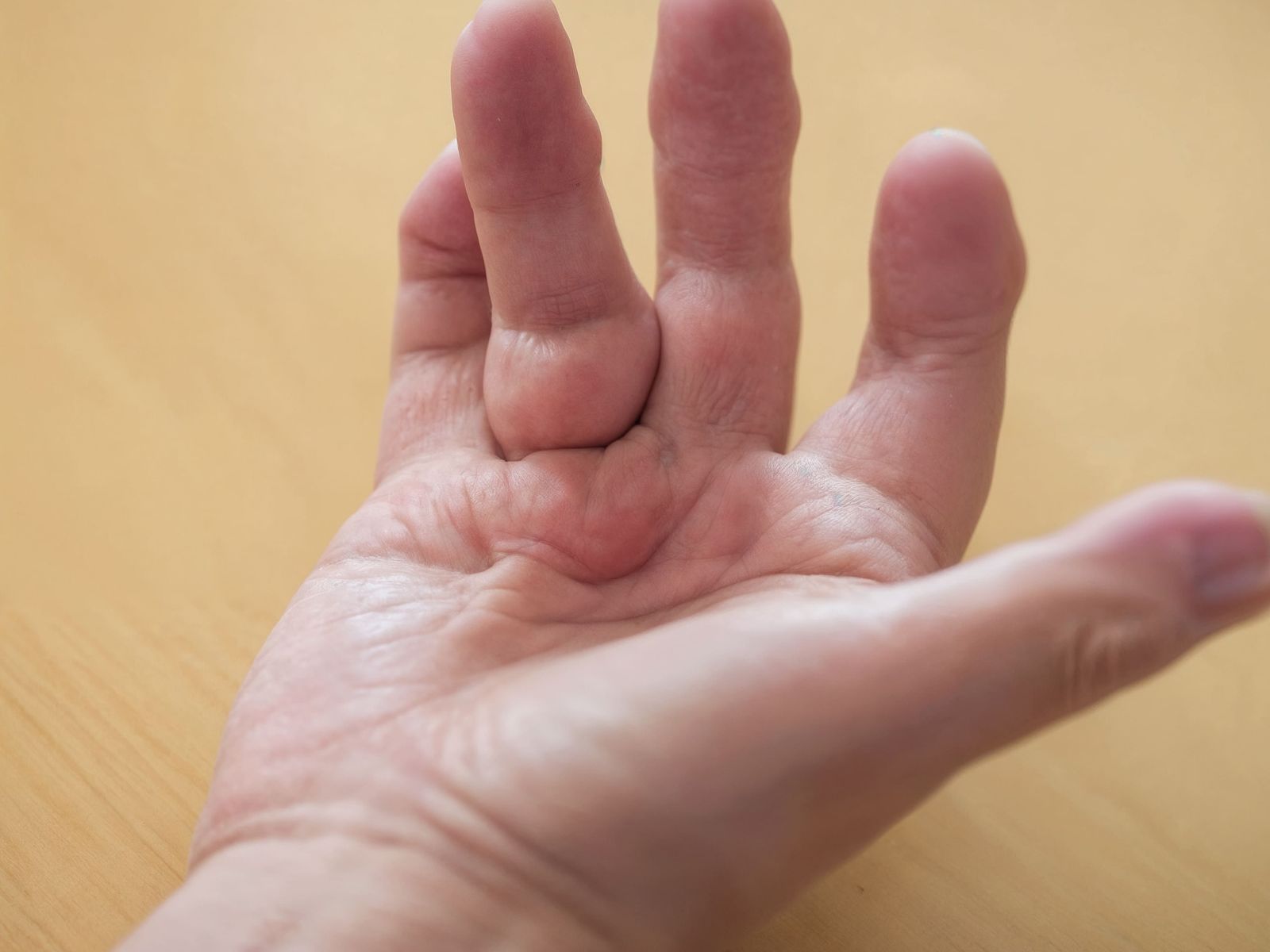 - Ukrivljenost prstov: eden najpogostejših simptomov je ukrivljenost prstov proti dlani, kar povzroča težave pri popolnem iztegnjenju prstov. Prizadeta prsta sta najpogosteje mezinec in prstanec, vendar se lahko stanje razvije tudi pri drugih prstih. Ta ukrivljenost prstov otežuje preprosta opravila, kot je rokovanje, držanje skodelice ali tipkanje na računalnik.