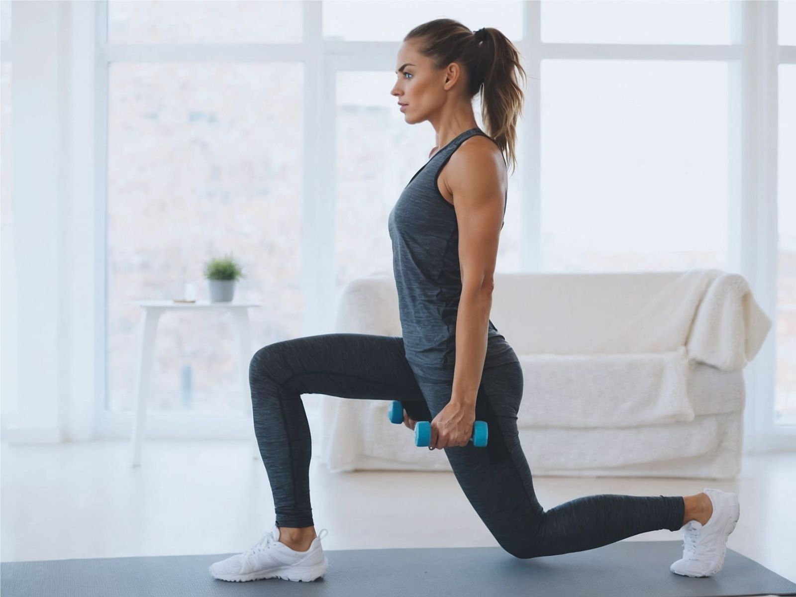 - Priprava: stopite naprej z eno nogo, medtem ko hrbet ostane raven in jedro čvrsto.